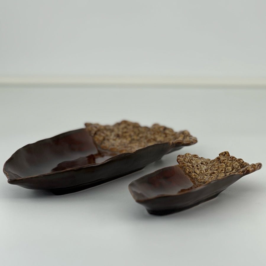 Elegant fat formet som eikenøtt i brunt steintøy. Med en unik reaktiv glasur gir dette fatet hvert produkt en særpreget farge og mønster. Perfekt til å tilføre et dekorativt preg i hjemmet, dette fatet måler 27 cm i bredde, 14,5 cm i dybde og 3,5 cm i høyde. Laget av solid steintøy, viser det både holdbarhet og stil. Den varme brunfargen passer perfekt inn i ethvert interiørdesign.