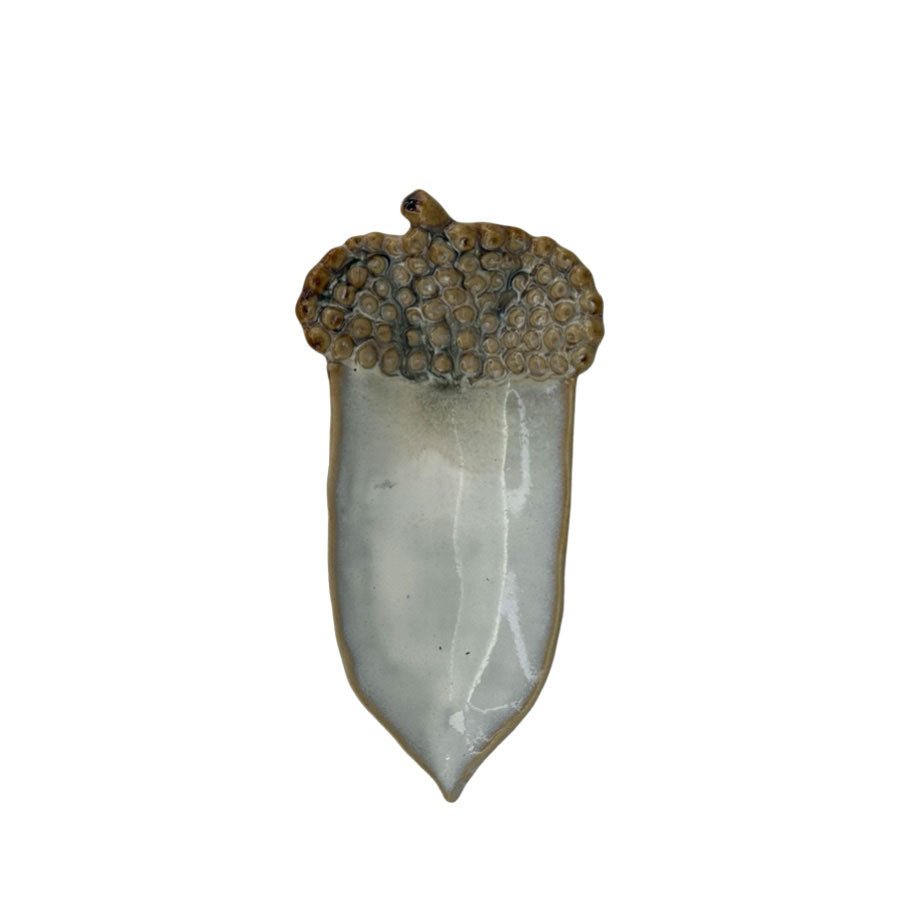Dette fatet formet som eikenøtt er et særegent dekorstykke laget av steintøy med en unik reaktiv glasur som gir hvert fat sitt eget særpreg i både farge og mønster. Med en bredde på 18,3 cm, dybde på 9,3 cm og høyde på 3,3 cm, passer dette stilfulle fatet perfekt til moderne interiør. Den hvite fargen kombineres elegant med det naturlige designet, og gjør dette produktet til et iøynefallende tilskudd til ditt hjem.