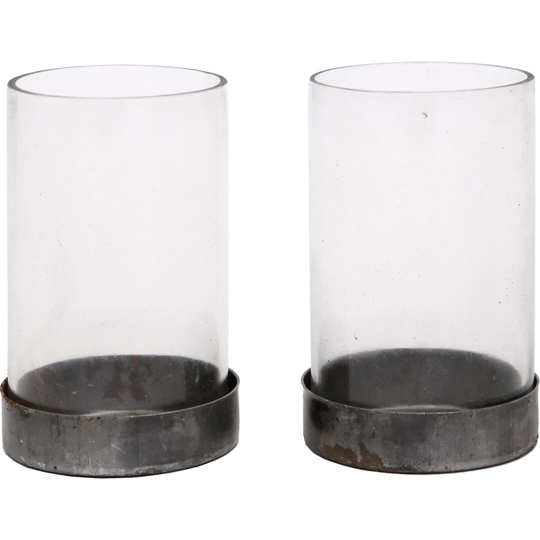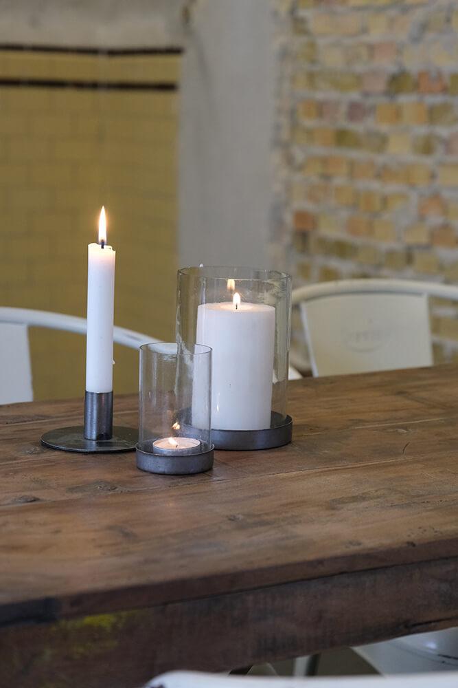 En enkel og stemningsfull liten lysestake med et industrielt preg. Lysestaken har en klar glasssylinder som beskytter flammen og en mørk metallbunn med rå finish. Perfekt for et telys hvor lyset kan skinne vakkert gjennom glasset. Bruk den alene eller kombiner flere i forskjellige størrelser for et koselig og harmonisk utseende på bordet, i vinduskarmen eller på terrassen. Mål: H:10 cm x B:6,5 cm x D:6,5 cm.