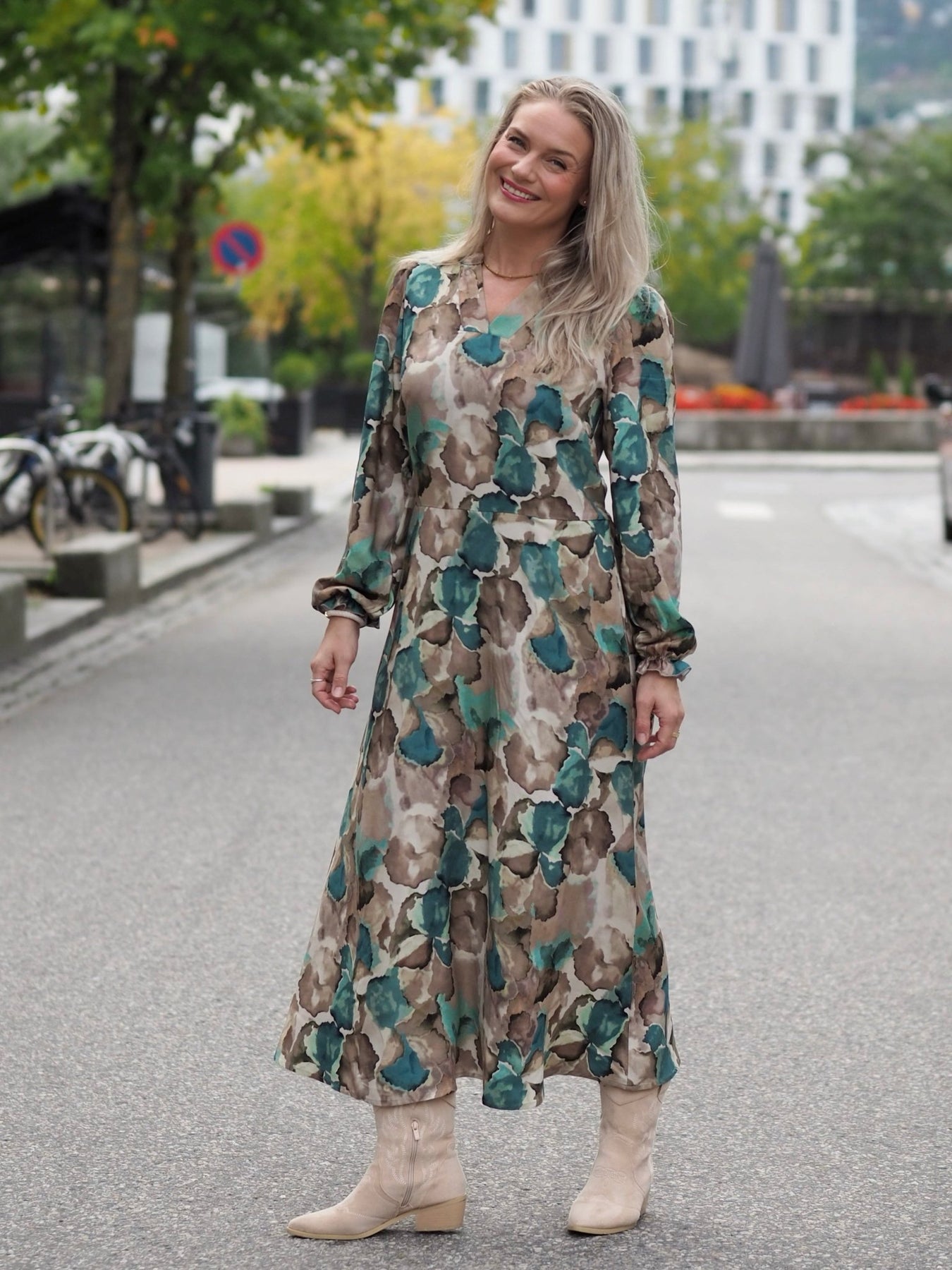 Elegante Lindevik kjolen i en vakker brun/grønn fargekombinasjon. Laget av 100% viscose, denne kjolen tilbyr både komfort og stil. Perfekt for enhver anledning, gir dens flytende design en feminin touch som fremhever ethvert antrekk. Gjør deg klar til å skinne med denne tidløse og stilige kjolen.