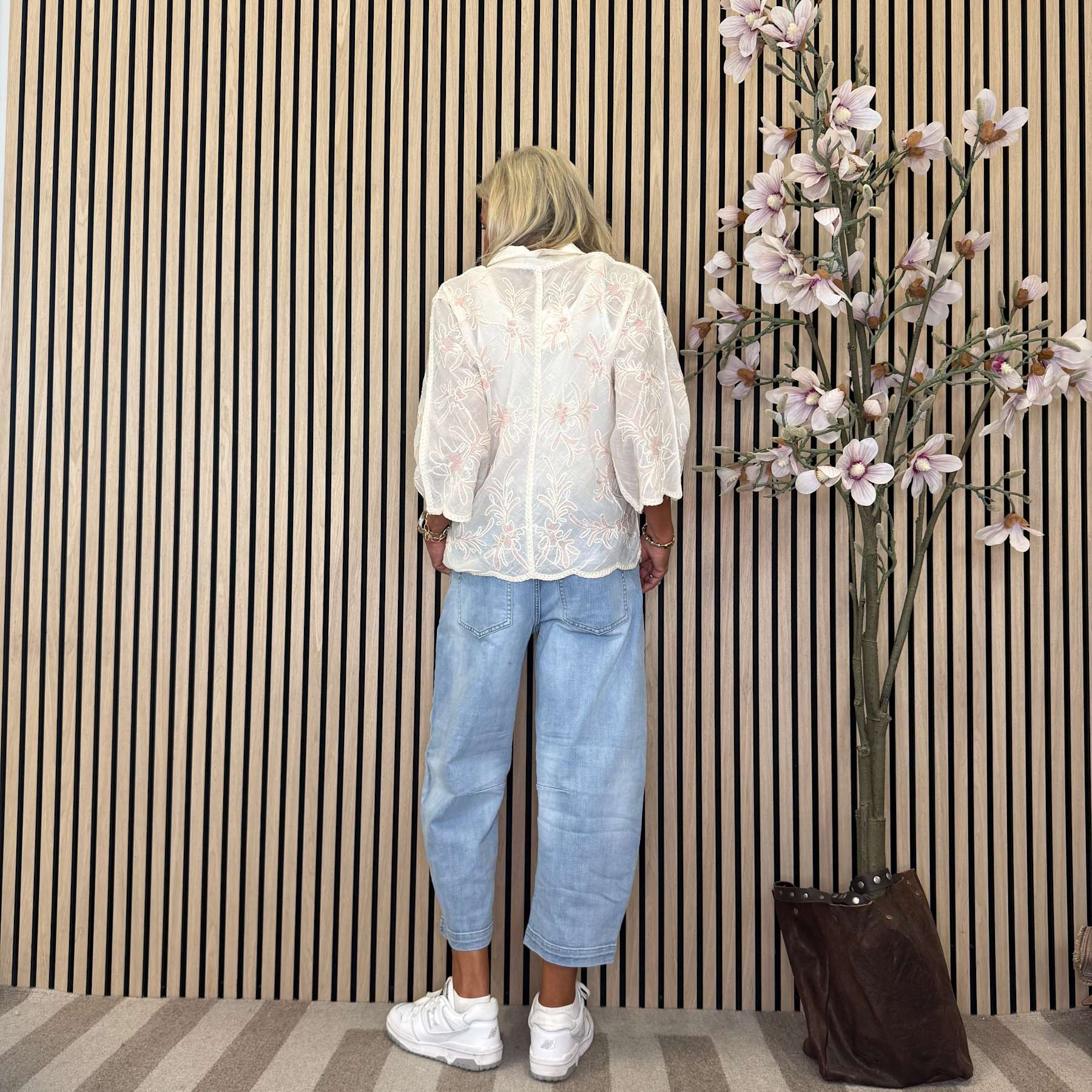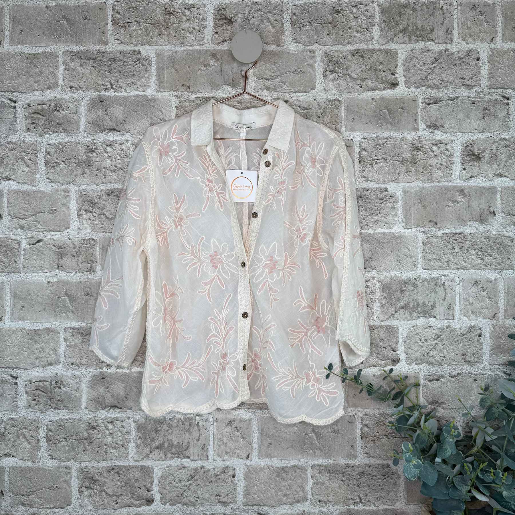 Nadiya-skjorten i en delikat beige og rosa fargekombinasjon. Denne stilige skjorten er laget av 100% bomull, noe som sikrer både komfort og pusteevne.