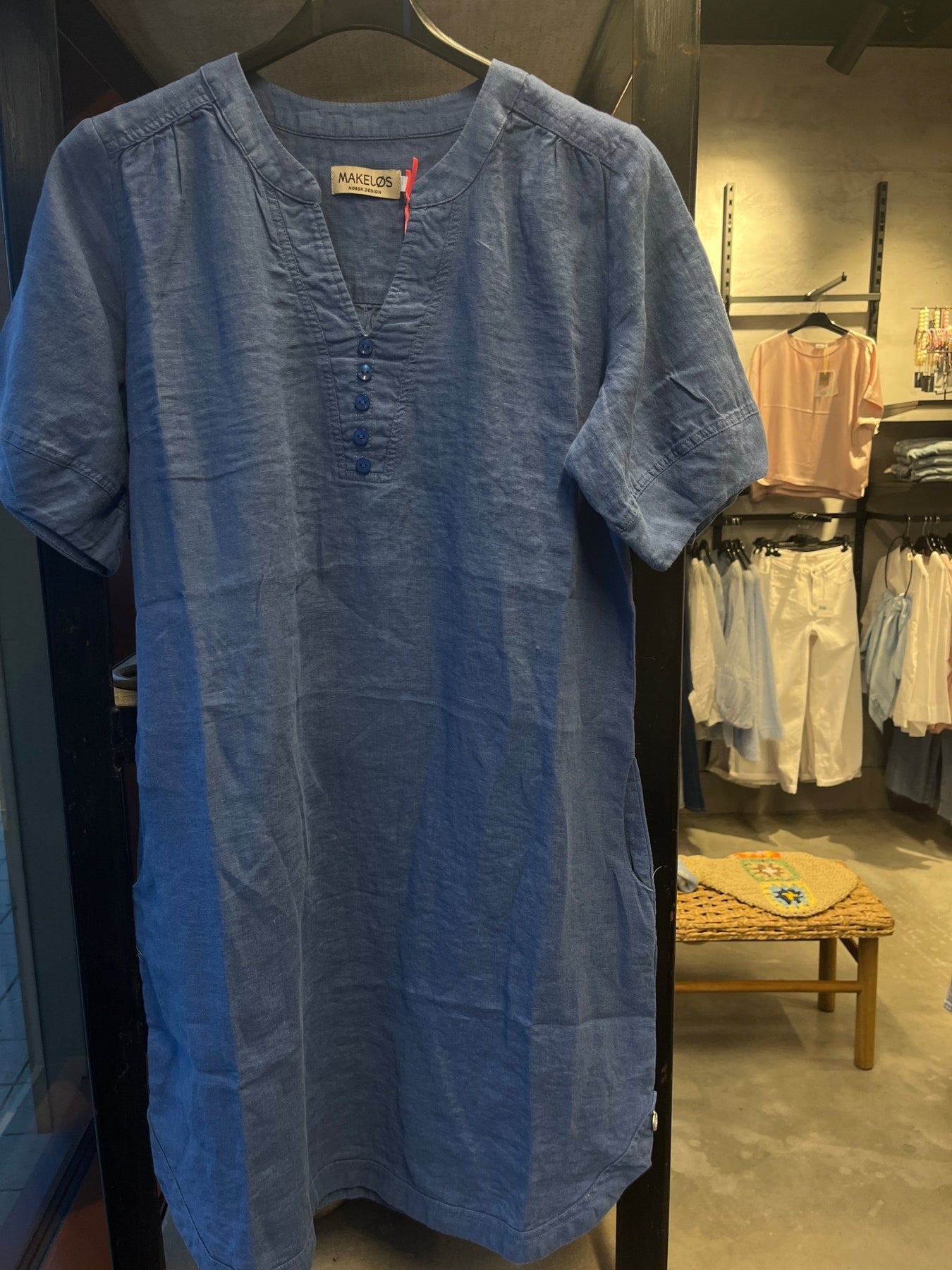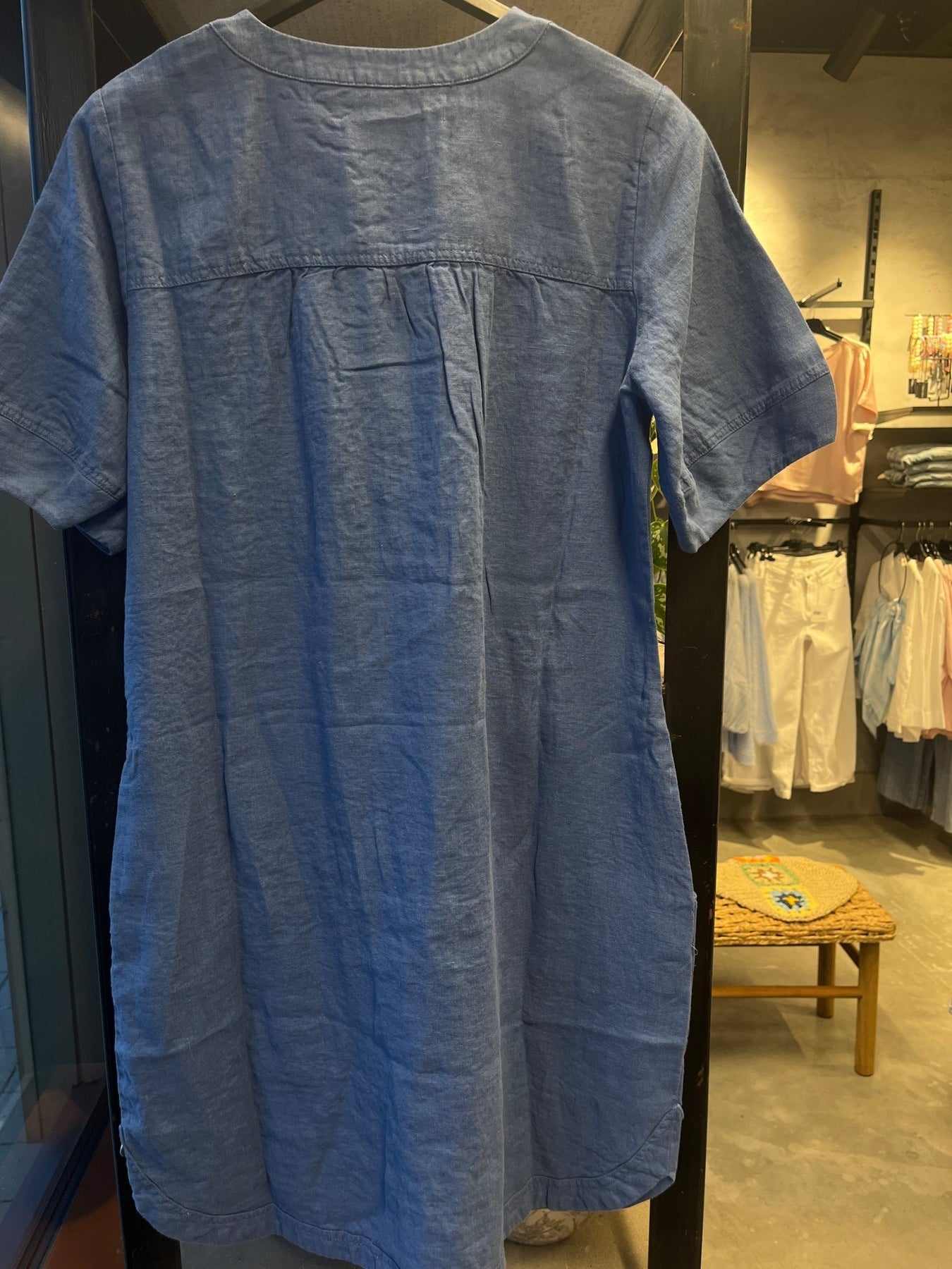 Solberg kjole i 100% lin - denim. Den har et klassisk snitt med knapper foran, korte ermer og en flatterende passform som passer enhver anledning.