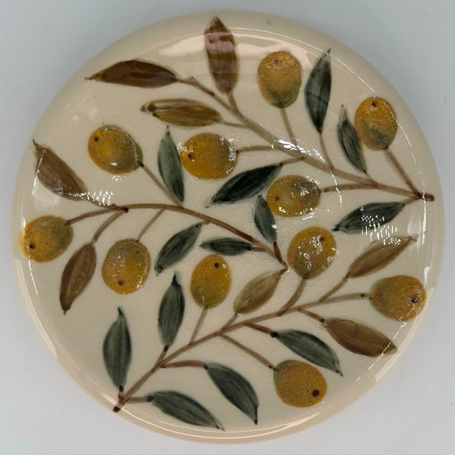 Vakkert håndmalt fat på fot. Håndmalte oliven og olivengrener. Det håndmalte mønsteret gjør hvert produkt unikt. Mål: H: 5cm x B: 20,5cm D: 20,5cm.
